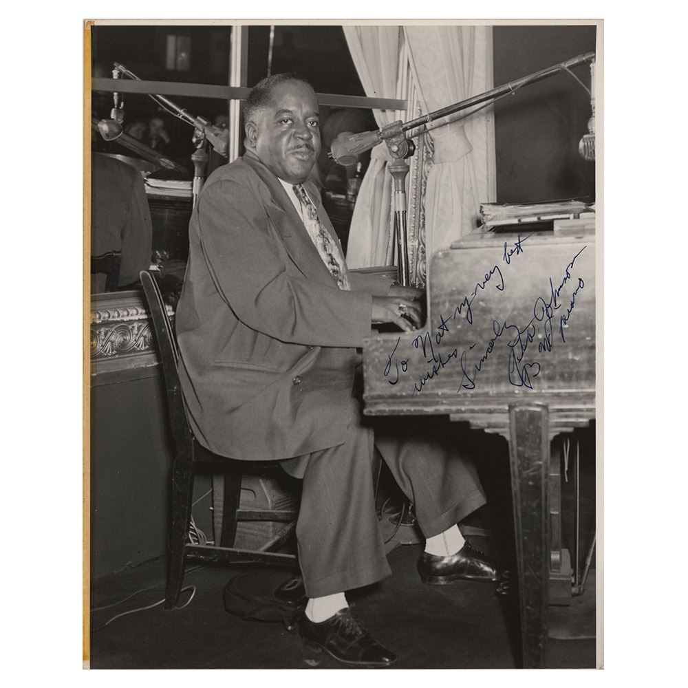 American boogie-woogie and jazz pianist (1904–1967) known for his versatility and technical virtuosity. Vintage matte-finish 8 x 10 photo of Pete Johnson at his piano, signed and inscribed in fountain pen, "To Nat, my very best wishes, Sincerely, Pete Johnson, B. W. piano.” In fine condition, with lightly trimmed borders, and a thin old tape stain along the left edge.