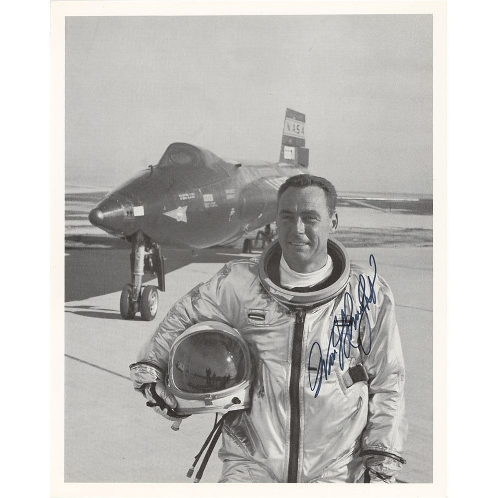 Classic 8 x 10 cardstock photo of Maj. Knight posing in front of the NASA X-15 hypersonic rocket plane, signed in black felt tip, "Wm. J. Knight." In fine condition.