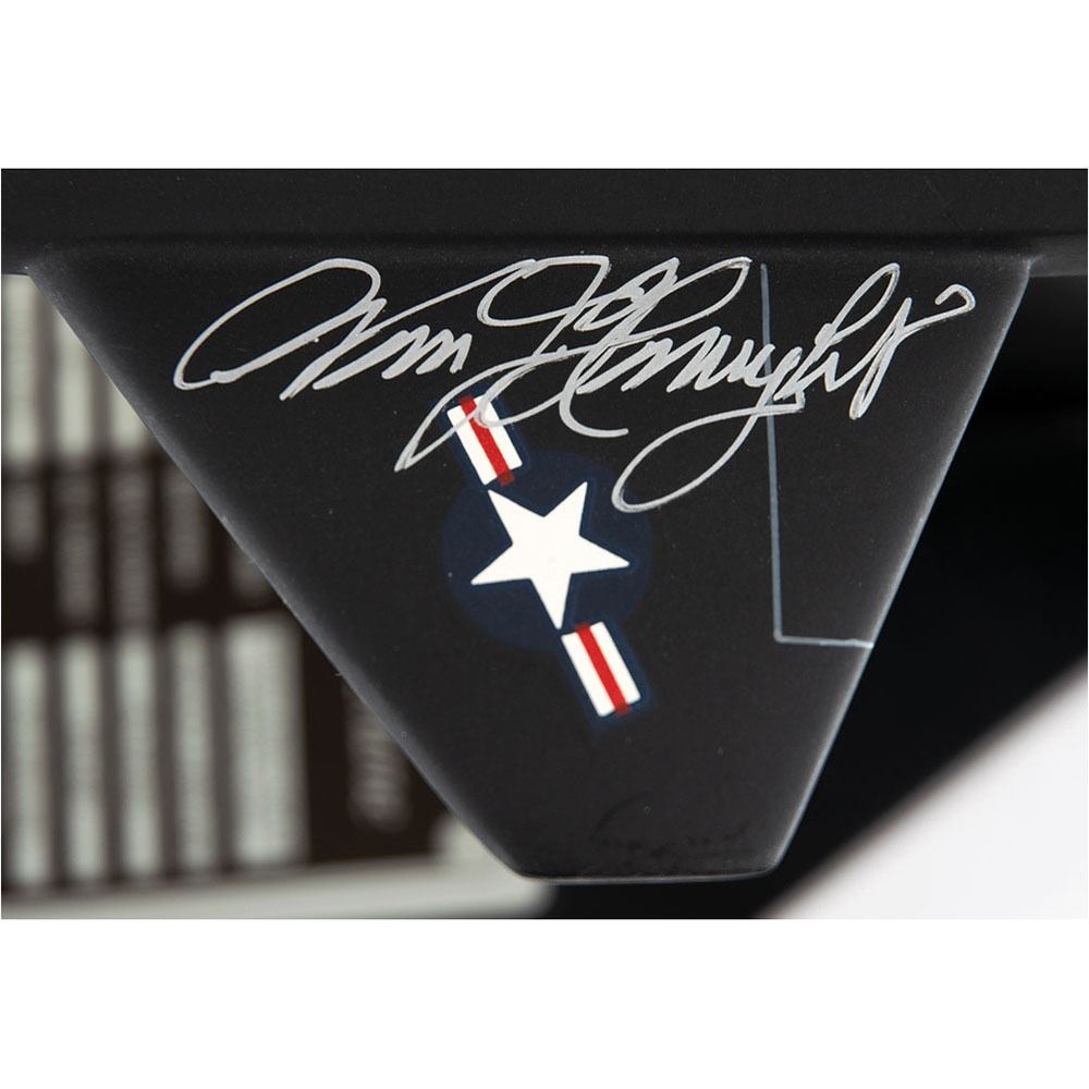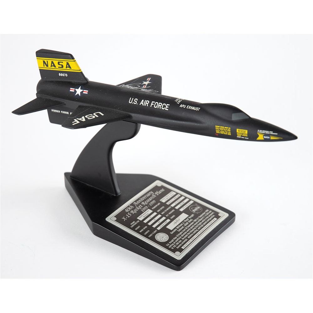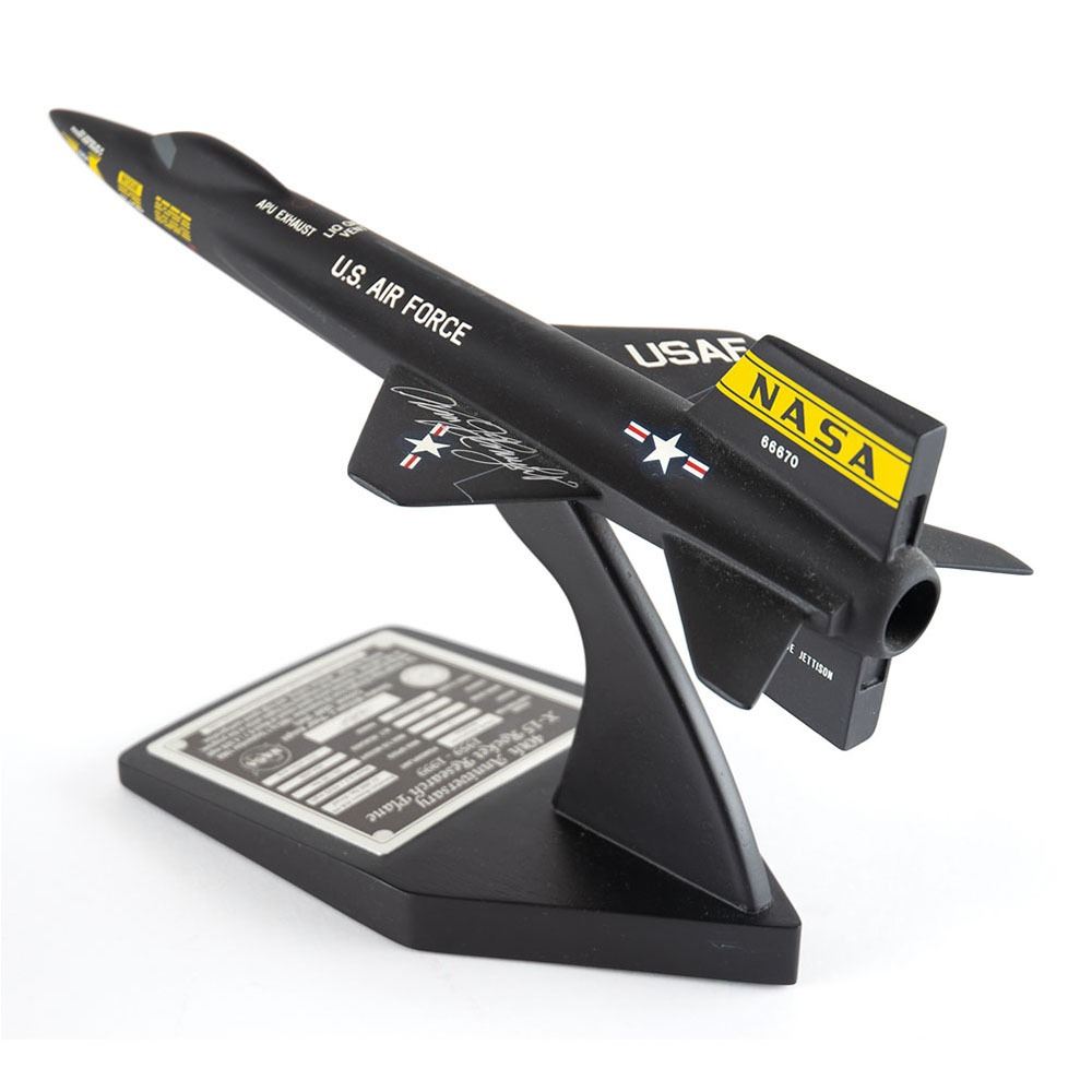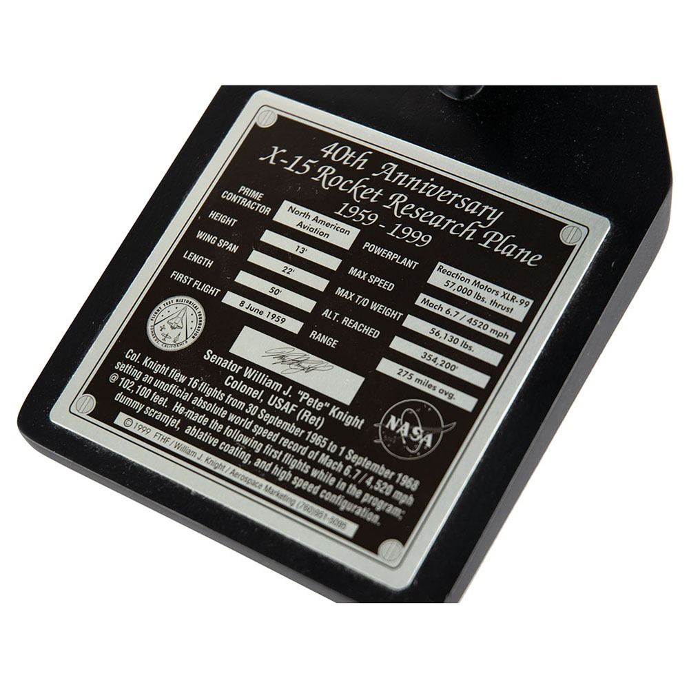 Limited edition 1:48 scale model replica of a North American Aviation X-15 Rocket Research Plane by Toys and Models Corporation. Numbered 88/500, the model, which measures 12.5è across and 5.5è from the tips of each wing, is set on a wooden base with an affixed ‰ÛÏ40th Anniversary‰Û plaque to an approximate height of 6.5è. The left wing is signed in silver ink by Pete Knight, ‰ÛÏWm. J. Knight.‰Û In fine condition. Accompanied by a certificate of authenticity from the Flight Test Historical Foundation. Knight was the pilot when the X-15 achieved it's highest speed of 4,250 miles per hour in October 1967. This set the official world record for highest speed recorded by a crewed, powered aircraft‰ÛÓa record that still stands today.