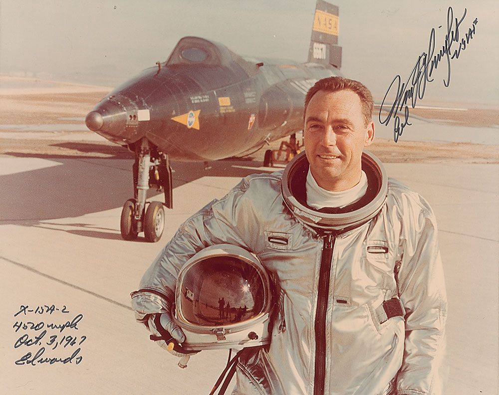 Color satin-finish 10 x 8 photo of Knight posing in front of his jet, signed in black felt tip, “Wm. J. Knight, X-15 A-2, 4520 mph, Oct. 3, 1967, Edwards.” In very fine condition.