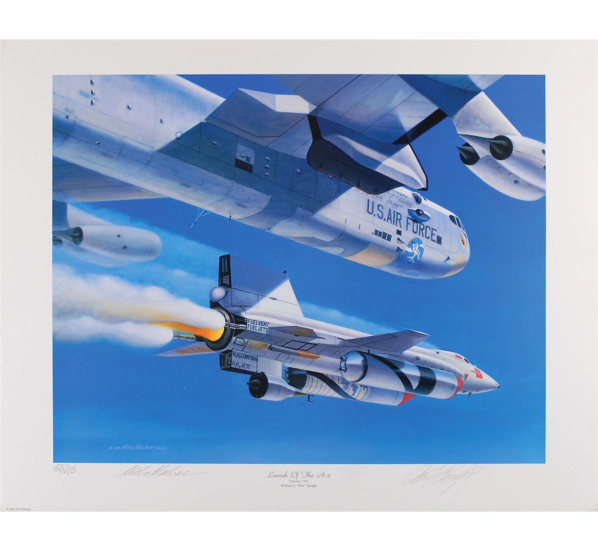 Color limited edition 24 x 19 print entitled ‘Launch of the A-2,’ numbered 476/670, signed in pencil. Also signed in pencil by the artist, Mike Machat. In fine condition.