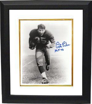 Pete Pihos was drafted in the third-round of the 1945 NFL Draft by the Eagles. Immediately after Pete joined the Eagles, the team marched to its first divisional championship. In the playoff game against the Pittsburgh Steelers for the Eastern Division crown, he blocked a punt to set up the first touchdown in the Eagles 21-0 win. Philadelphia won three straight divisional championships and then back-to-back NFL titles by shutout scores. Pete led the NFL in receiving from 1953 through 1955 and earned first-team All-Pro or All-League honors six times and was named to six Pro Bowls. Pete Pihos has hand autographed this Philadelphia Eagles 8x10 Photo with HOF 70 Inscription. Certificate of Authenticity from Athlon Sports. Custom White Mat and Premium Black Frame as shown.