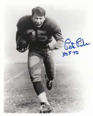Pete Pihos was drafted in the third-round of the 1945 NFL Draft by the Eagles. Immediately after Pete joined the Eagles, the team marched to its first divisional championship. In the playoff game against the Pittsburgh Steelers for the Eastern Division crown, he blocked a punt to set up the first touchdown in the Eagles 21-0 win. Philadelphia won three straight divisional championships and then back-to-back NFL titles by shutout scores. Pete led the NFL in receiving from 1953 through 1955 and earned first-team All-Pro or All-League honors six times and was named to six Pro Bowls. Pete Pihos has hand autographed this Philadelphia Eagles 8x10 Photo with HOF70 Inscription. Certificate of Authenticity from Athlon Sports.