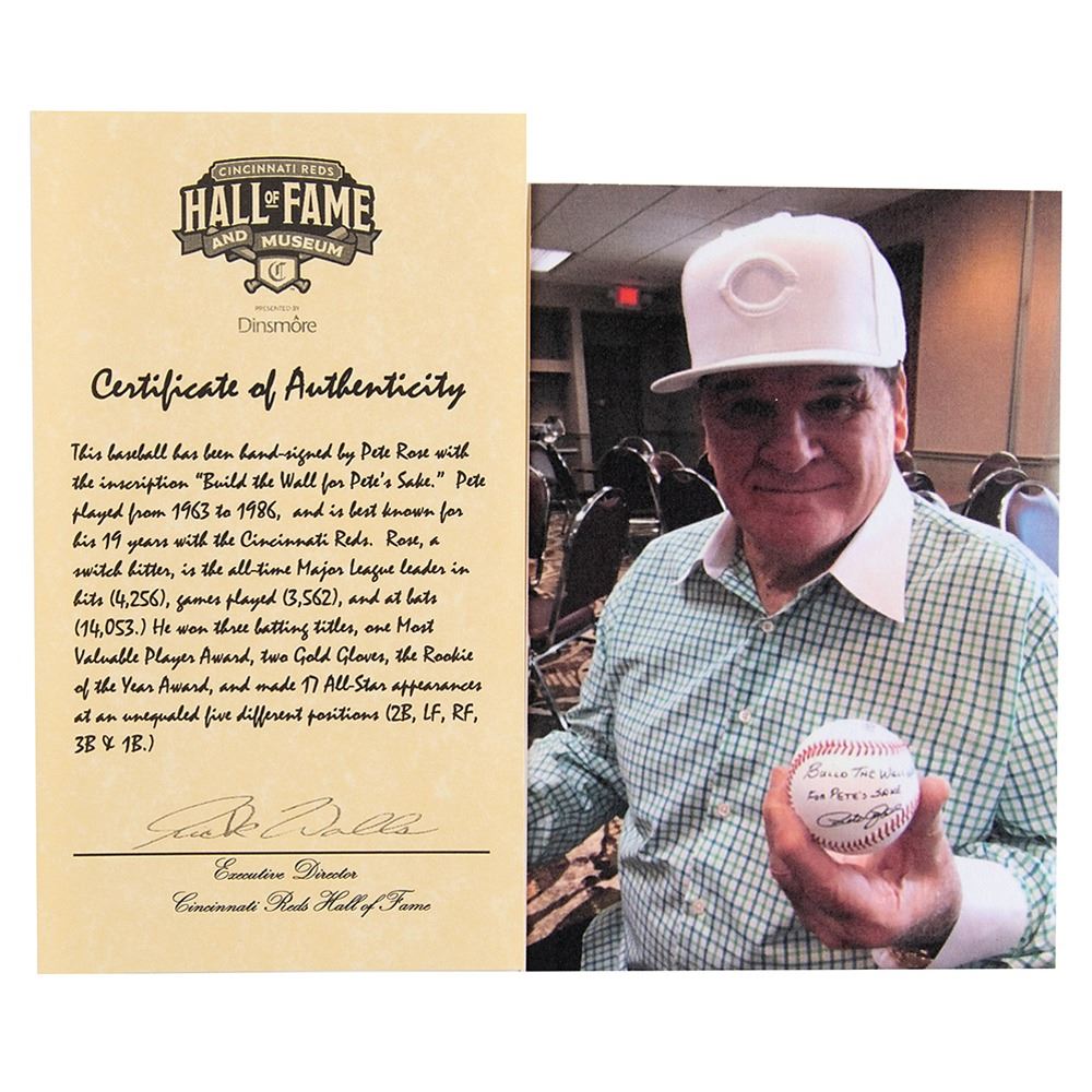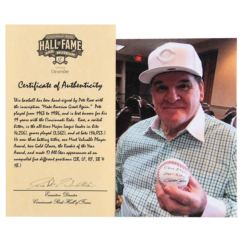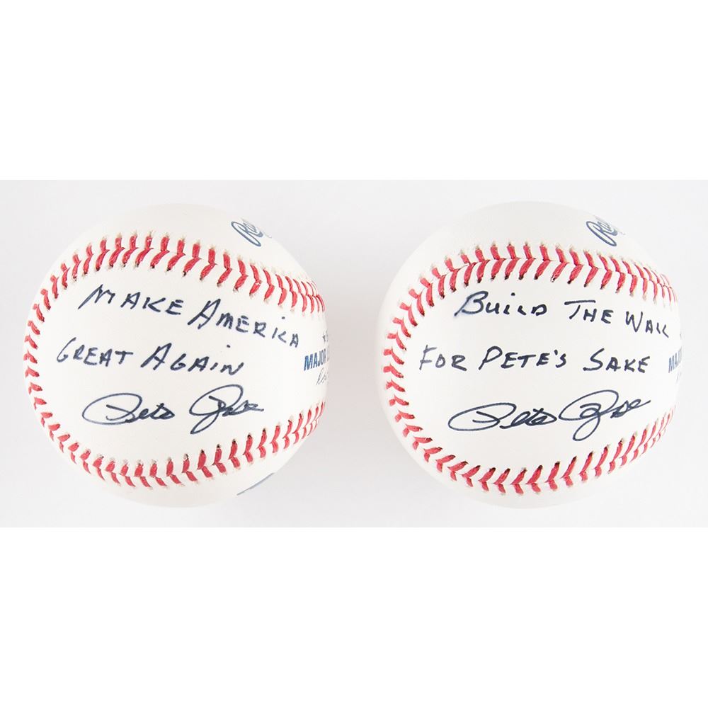 Two official Rawlings Major League (Manfred) baseballs, signed on the side panels in black felt tip with political slogans: "Make America Great Again, Pete Rose" and "Build the Wall for Pete's Sake, Pete Rose." In overall very fine condition. Accompanied by two certificates of authenticity from the Cincinnati Reds Hall of Fame and two photos of Rose at the time of the signing.