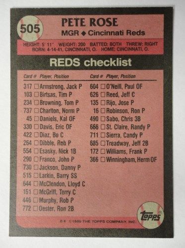 1989 Topps #505 Pete Rose Autographed Card. NM-MT Condition, No COA. Est. Value $30.00 - $50.00.