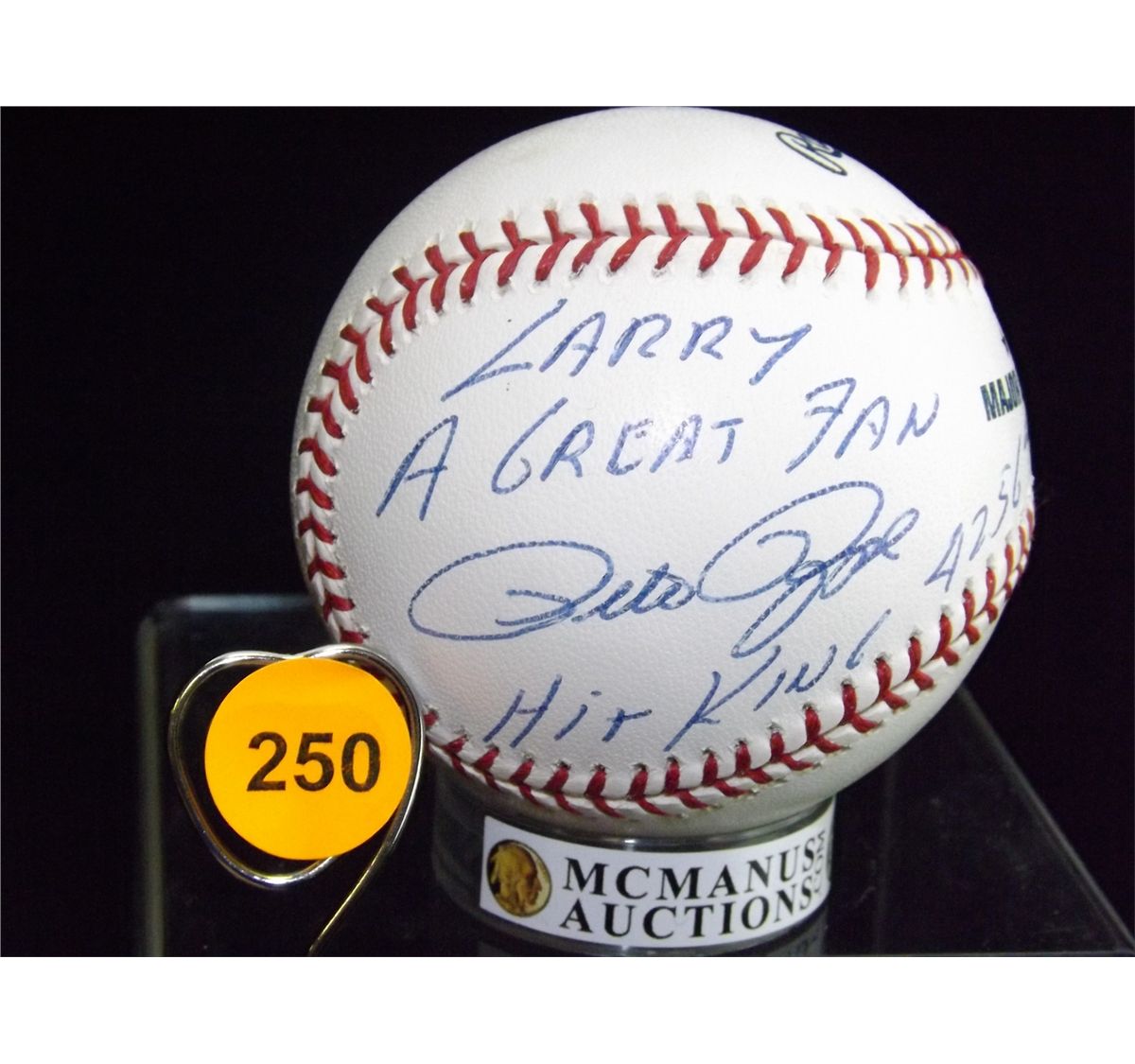 Pete Rose Autographed Baseball. Rawlings Official MLB. Appraised or estimated retail value $300. COA by Christopher Morales. All Sales Final. Please see terms and conditions of auction.
