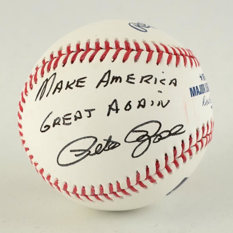 This baseball has been hand-signed by Pete Rose with the inscription "Make America Great Again." This piece comes with a photograph of Pete Rose Holding this Ball. Includes Certificate of Authenticity. Measures approx. 3" x 3" (baseball).