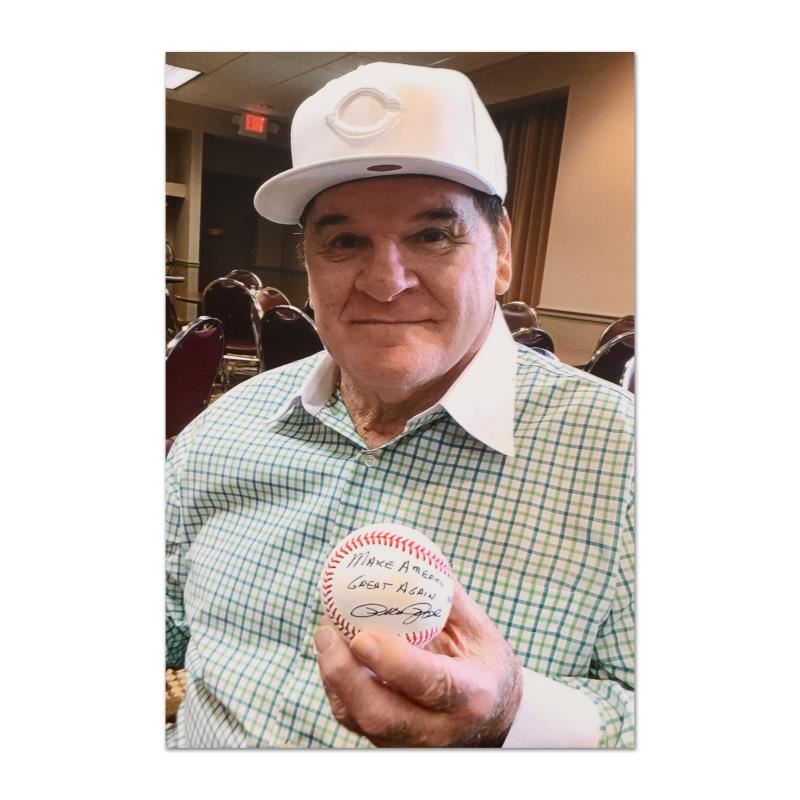 This baseball has been hand-signed by Pete Rose with the inscription "Make America Great Again." This piece comes with a photograph of Pete Rose Holding this Ball. Includes Certificate of Authenticity. Measures approx. 3" x 3" (baseball).