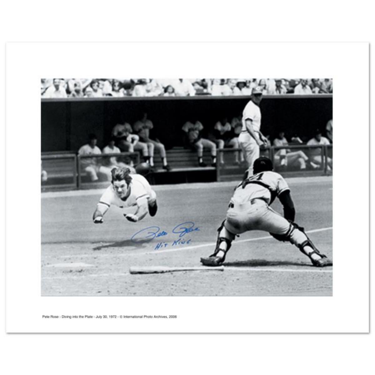 "Pete Rose Diving Into The Plate" is an archival photograph featuring the legendary baseball player diving safely into home plate! This photo was taken on July 30, 1972 and is autographed boldly by Pete Rose. Includes Certificate of Authenticity. Measures approx. 20" x 16" (image). Reference #: 214047.