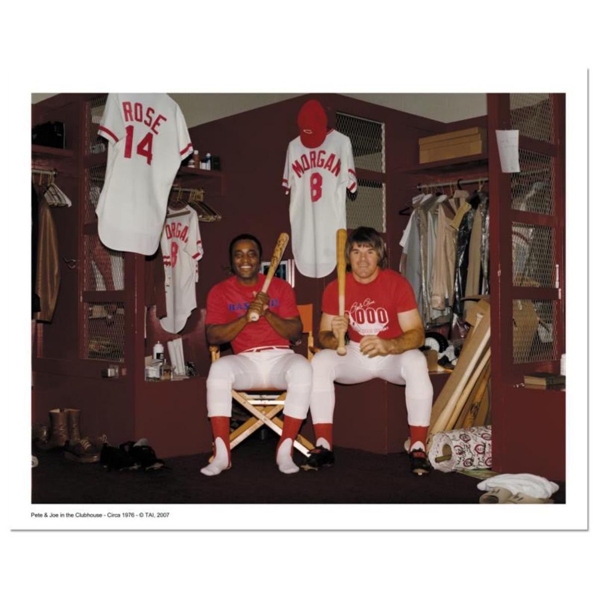"Pete Rose & Morgan in Clubhouse" is an archival photograph that is autographed by Pete Rose and Joe Morgan! Includes Certificate of Authenticity. Measures approx. 20" x 16" (image). Reference #: 214585.