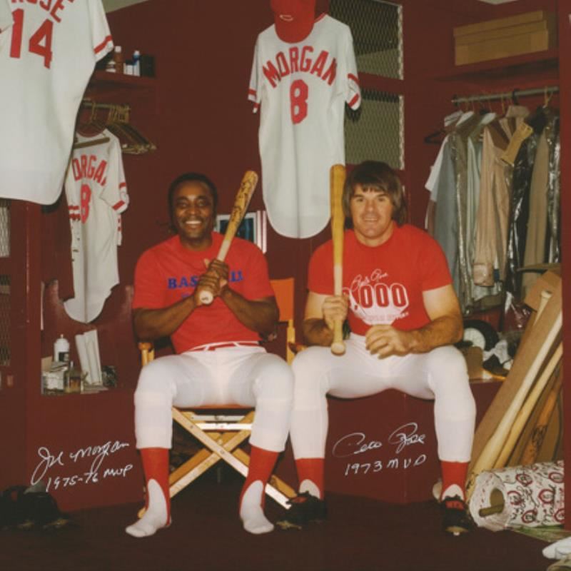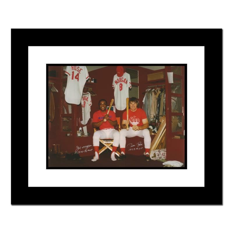 "Pete Rose & Morgan in Clubhouse" is an archival photograph that is autographed by Pete Rose and Joe Morgan! This piece comes framed. Includes Certificate of Authenticity. Measures approx. 26" x 22" (frame), 20" x 16" (image).