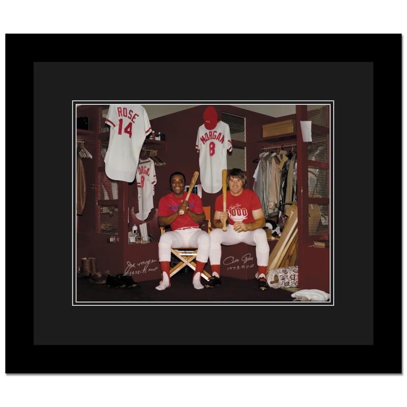 "Pete Rose & Morgan in Clubhouse" is an archival photograph that is autographed by Pete Rose and Joe Morgan! This piece comes framed. Includes Certificate of Authenticity. Measures approx. 26" x 22" (frame), 20" x 16" (image).