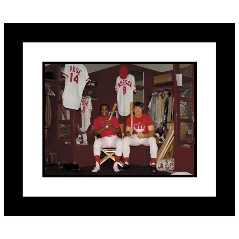 "Pete Rose & Morgan in Clubhouse" is an archival photograph that is autographed by Pete Rose and Joe Morgan! This piece comes framed. Measures approx. 26" x 22" (frame), 20" x 16" (image).