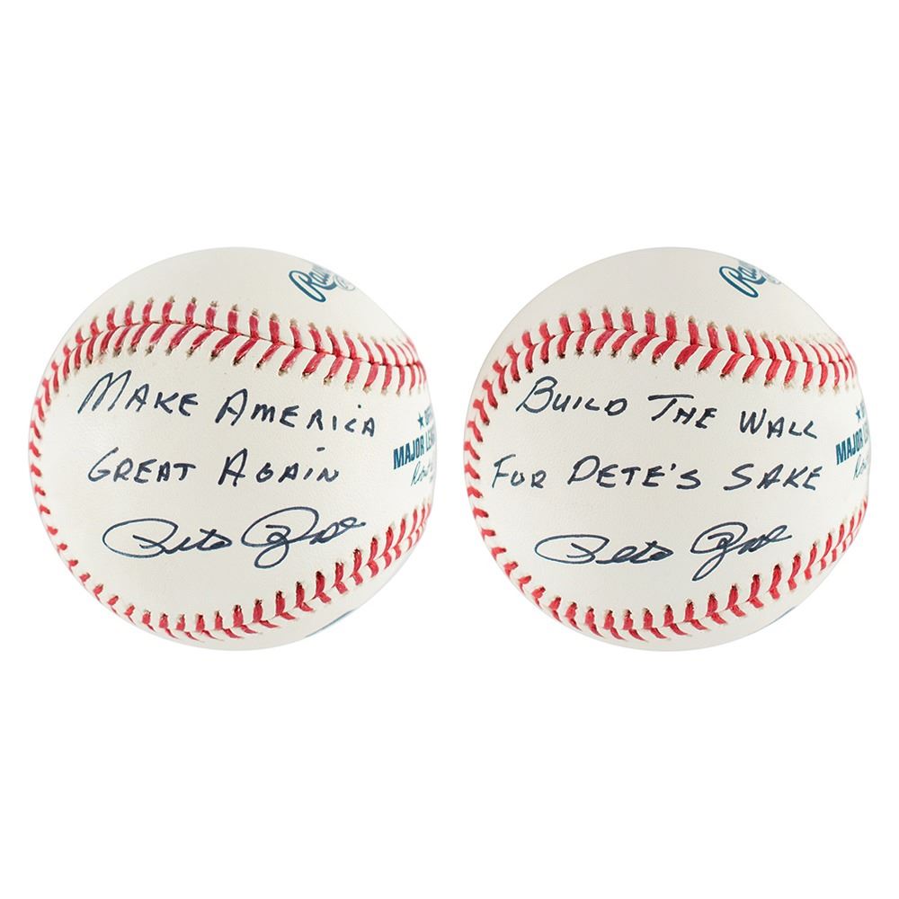 Two official Rawlings Major League (Manfred) baseballs, signed on the side panels in black felt tip with political slogans: "Make America Great Again, Pete Rose" and "Build the Wall for Pete's Sake, Pete Rose." In overall very fine condition.