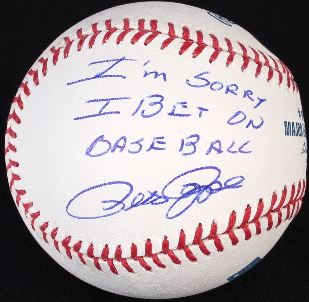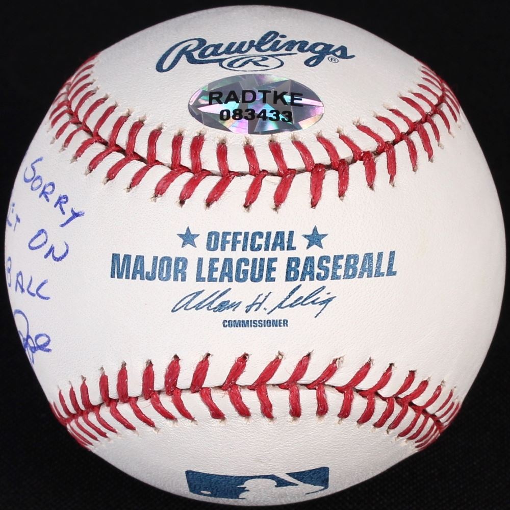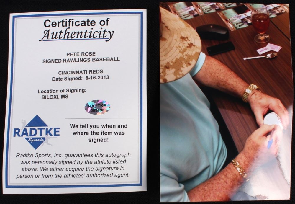 Official Major League Baseball hand-signed and inscribed in blue ink pen by Pete Rose (Reds). The autograph includes an official Radtke Sports hologram and matching COA for authenticity purposes. Also includes a proof picture from the signing.