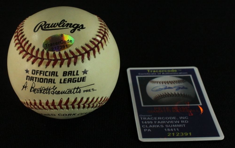Official National League Baseball. Hand-signed in blue ink by Pete Rose (Reds). Autograph includes a Tracercode hologram and matching COA for authenticity purposes.