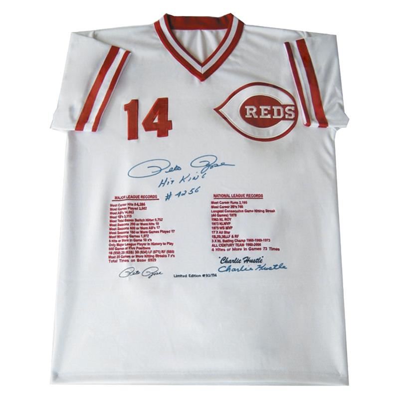 This baseball jersey has been hand-stitched with Pete Rose baseball stats and is autographed by Pete Rose. Includes Certificate of Authenticity. Measures approx. 46" long and 33" across.