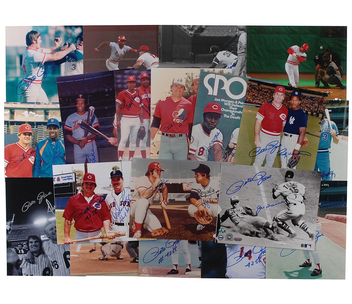 Amazing collection of 26 photos of various finishes, most color, primarily 8 x 10 and 10 x 8, with eight signed individually by Rose and 18 signed by Rose along with the other players pictured. Other signers include: George Brett, Rickey Henderson, Wade Boggs, Gary Carter, Tony Perez and Dave Parker, Rod Carew, Joe Morgan, Joe Torre, Dale Murphy, Bud Harrelson, Earl Williams, Vince Coleman, Dwight Gooden and Dave Parker, Jim Kaat, Steve Garvey, and Kent Hrbek. In overall fine condition.