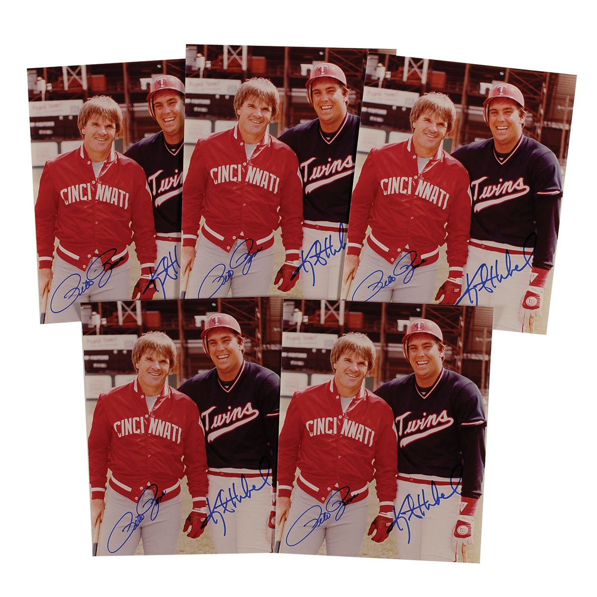 Five identical color glossy 8 x 10 photos of Rose and Hrbek posing together during spring training, each signed in blue felt tip by Pete Rose and Kent Hrbek. In fine condition.