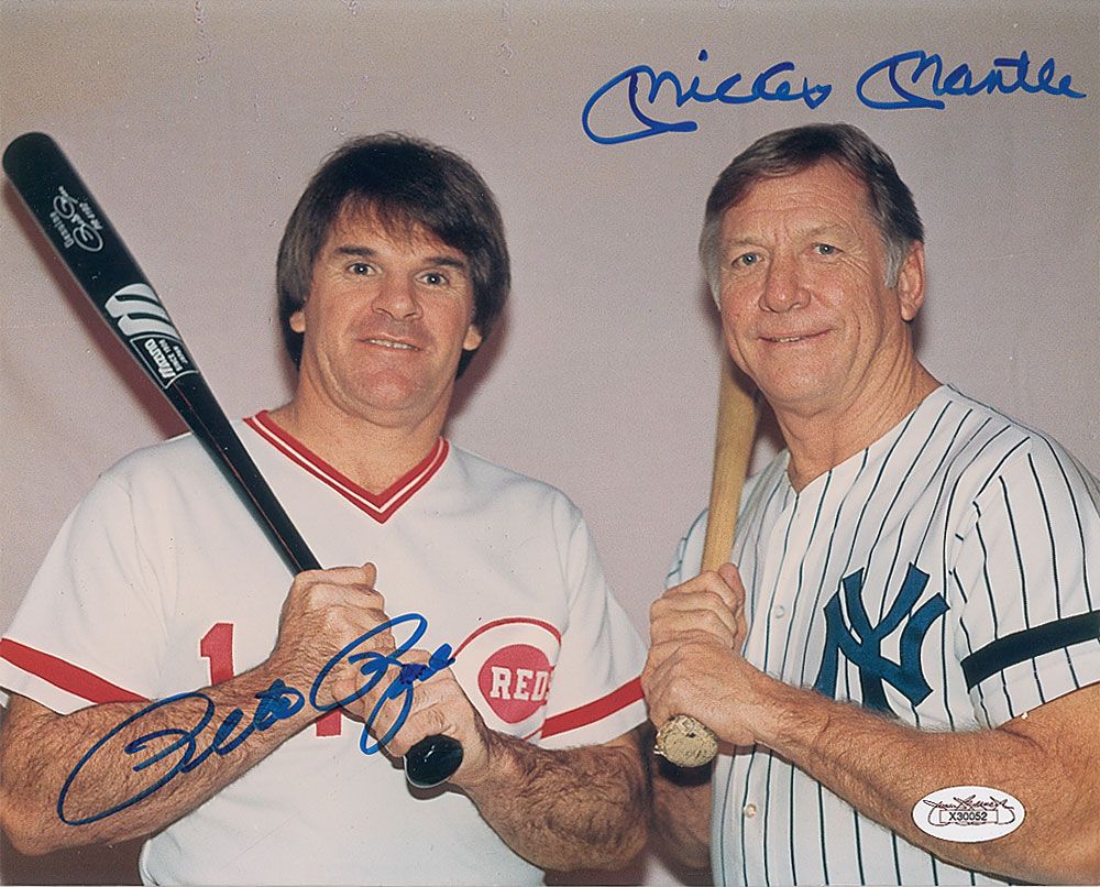 Color glossy 10 x 8 photo of the legendary ballplayers in their later years, signed in blue felt tip by both. In fine condition, with a JSA label affixed to the lower right corner.