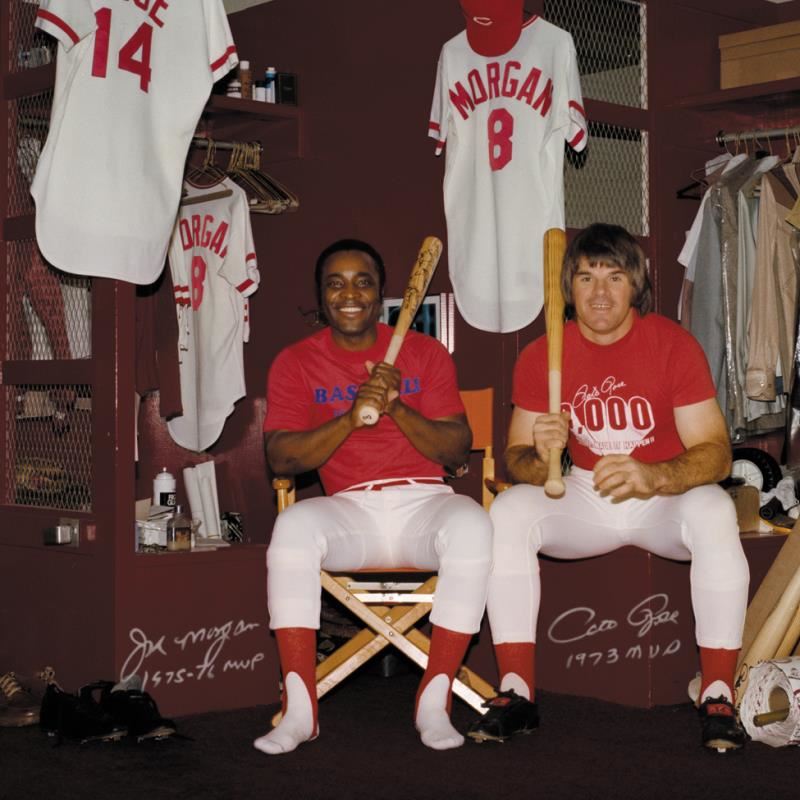"Pete Rose & Morgan in Clubhouse" is an archival photograph that is autographed by Pete Rose and Joe Morgan! Includes Certificate of Authenticity. Measures approx. 20" x 16" (image).