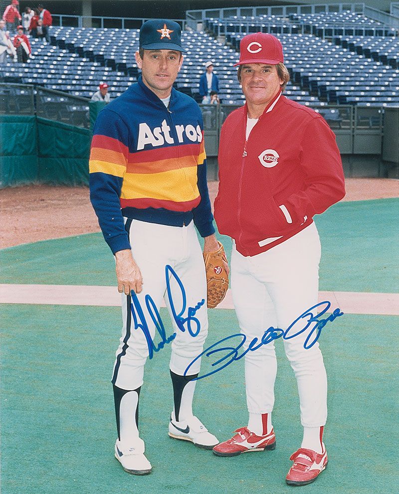 Uncommon color glossy 8 x 10 photo of the all-time hit and strikeout record holders, signed in blue felt tip by both. In fine condition.