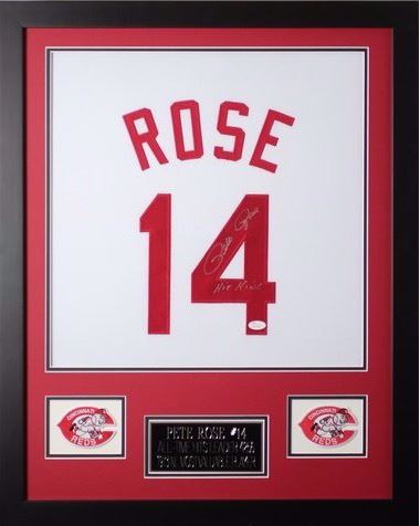 Jersey Details: The Jersey is a White Pro Style Pete Rose Cincinnati Reds Jersey and the name and numbers are stitched onto the Jersey.Autograph Certification: The Autograph is JSA Certified and the Jersey has the JSA sticker and the paper certificate with the matching certification # will be attached to the back of the frame. JSA is one of the leading authenticators in the memorabilia industry, so you can be 100% certain this autograph is authentic.Quality: Our framers take extreme care and pride in making your Framed Sports Jersey and only use the highest quality materials and licensed products. This Framed Sports Jersey will look absolutely gorgeous in your home or office and comes ready to hang right out of the box.Framing DetailsFrame: 24" X 30" Black SOLID WOOD FrameGlass: UV Protected AcrylicMatting: Triple Acid Free Team Colored Matting (made especially for framing sports memorabilia)Patches: Stitched Team Logo PatchesName Plate: Includes Players Name with Career Achievement(s). This item comes with a Certificate of Authenticity from a third party authenticator. This Certification of Authenticity does not imply that the item will be certified by any other rival authentication companies. The accompanied certification is the only certification the auction company can confirm. These items are being sold as collectable pieces and there is no guarantee that this item can be resold on any online marketplace. Each of these companies has their own policies and politics.