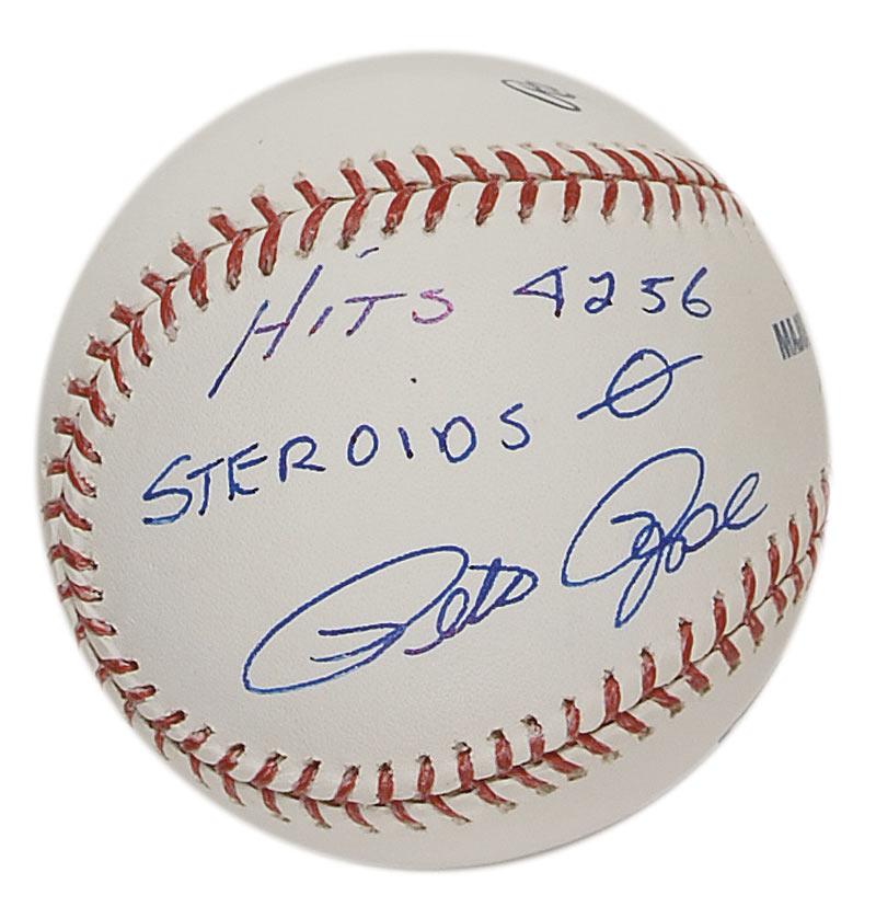 Official Rawlings Major League baseball signed in blue ballpoint on a side panel, “Hits 4256, steroids Ø, Pete Rose.” In very fine condition.