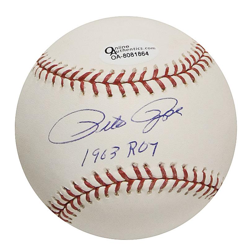 Official Rawlings National League baseball signed in blue ballpoint on the sweet spot, “Pete Rose, 1963 ROY.” In very fine condition.