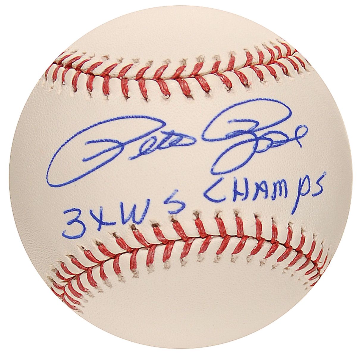 Official Rawlings Major League baseball signed in blue ballpoint on the sweet spot, “Pete Rose 3xWS Champs.” In very fine condition.