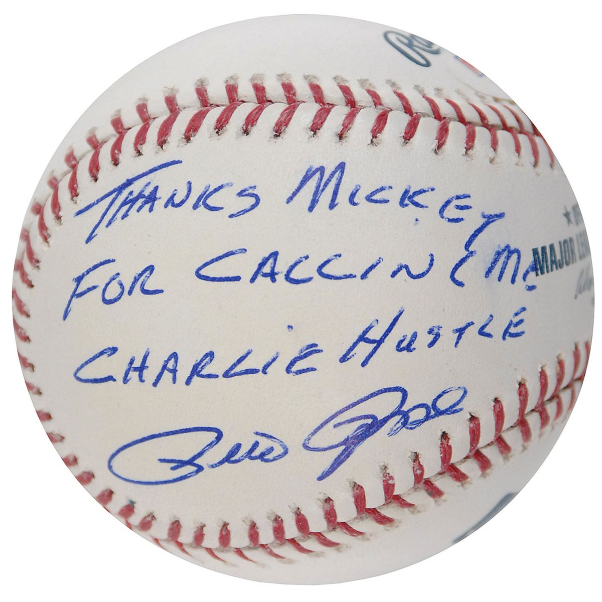 Official Rawlings Major League baseball signed in blue ballpoint on a side panel, “Thanks Mickey for calling me Charlie Hustle, Pete Rose.” In fine condition.
