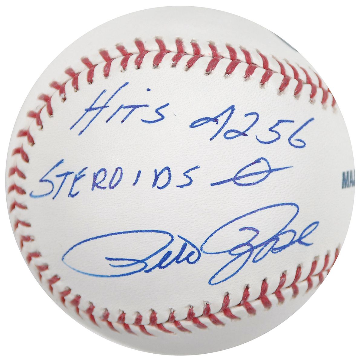 Official Rawlings Major League baseball signed in blue ballpoint on a side panel, “Hits 4256, Steroids Ø, Pete Rose.” In very fine condition. Accompanied by a certificate of authenticity from PSA/DNA.