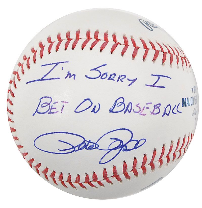 Official Rawlings Major League baseball signed in blue ballpoint on a side panel, “I’m sorry I bet on baseball, Pete Rose.” In very fine condition, with a JSA label affixed to the reverse. Accompanied by a certificate of authenticity from JSA.