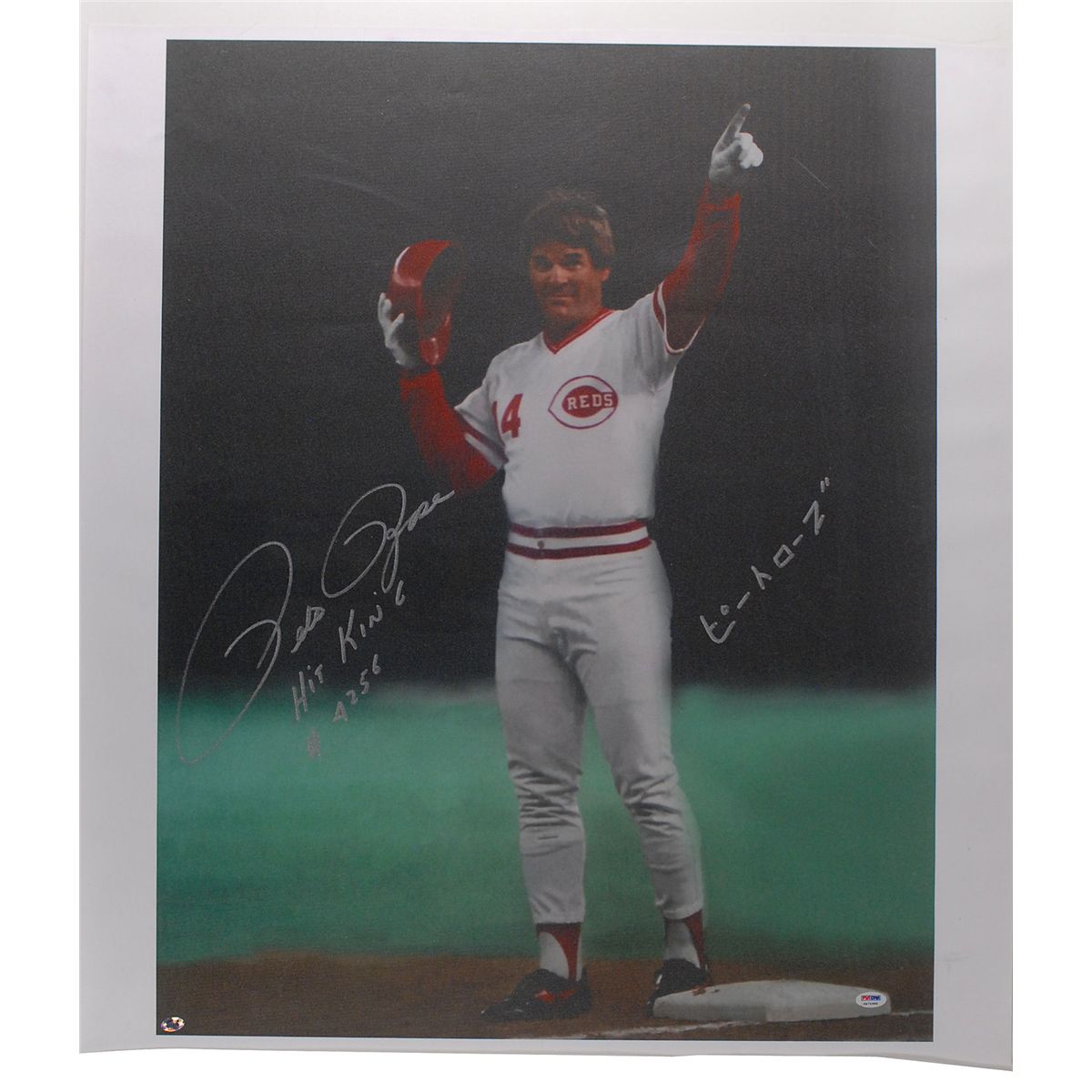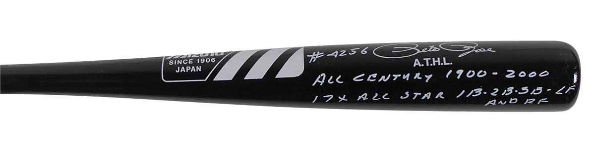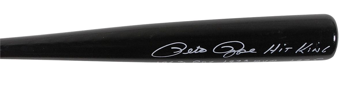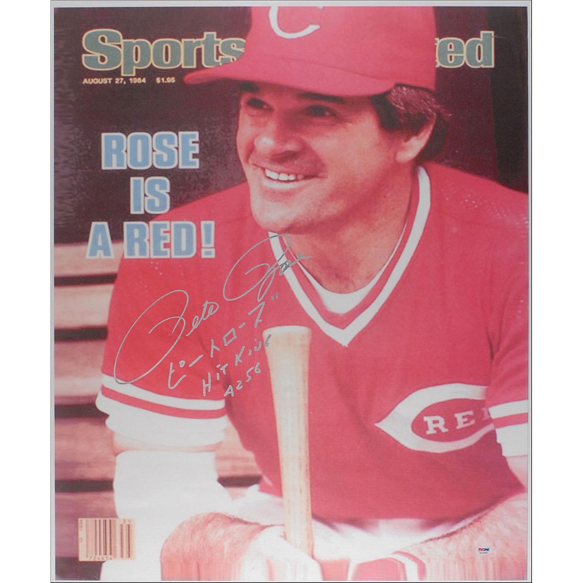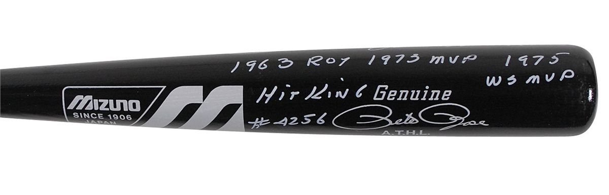 Three items: official Mizuno Pete Rose commemorative baseball bat signed in silver ink on the barrel, “Pete Rose, Hit King,” with Rose listing his career achievements around the barrel; color 30 x 33 canvas print of Rose acknowledging the crowd after his record-breaking hit, signed in silver ink, “Pete Rose, Hit King #4256,” signing again in Kanji characters below; and a color 27 x 32.5 canvas print of the August 27, 1984, cover of Sports Illustrated, signed in silver ink, “Pete Rose, Hit King 4256,” signing again in Kanji characters below. Both prints are rolled. In fine condition.