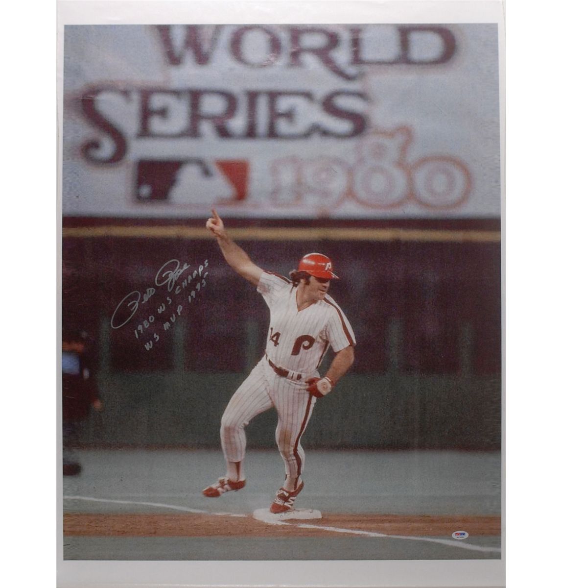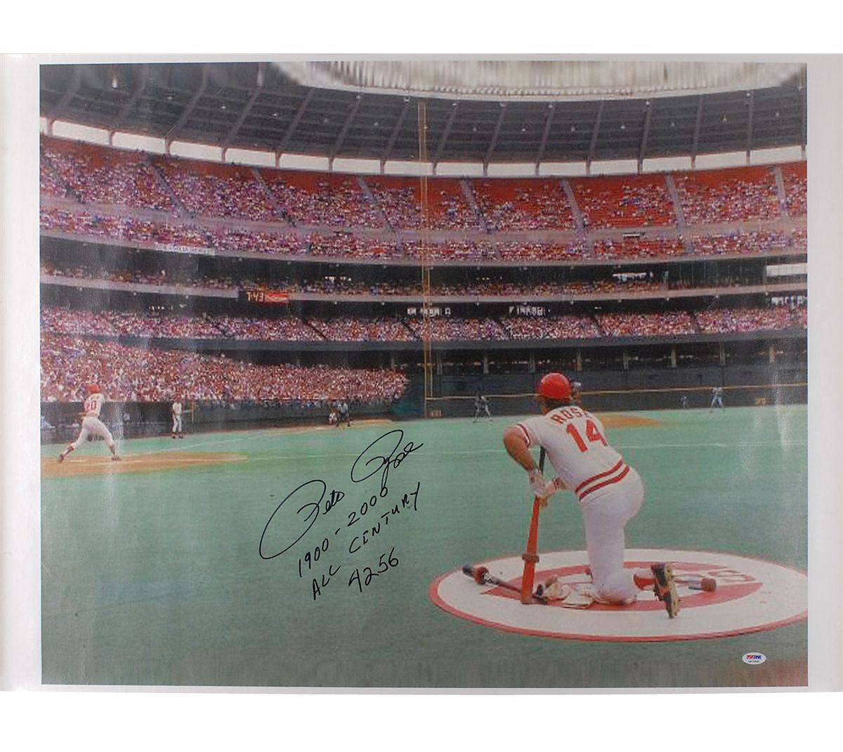 Four different color giclee prints on canvas, from various points of Rose’s career, three approximately 26.75 x 36 and one 36 x 52, each signed in ink or felt tip, with Rose adding some of his career highlights to each. Rolled and in fine condition. Each is accompanied by a certificate of authenticity from PSA/DNA.