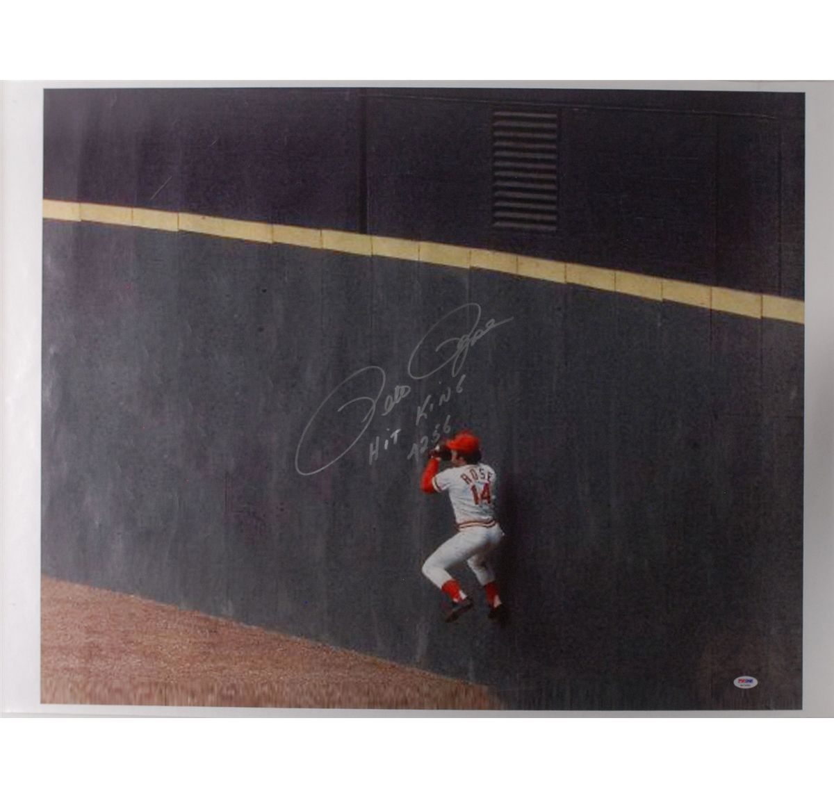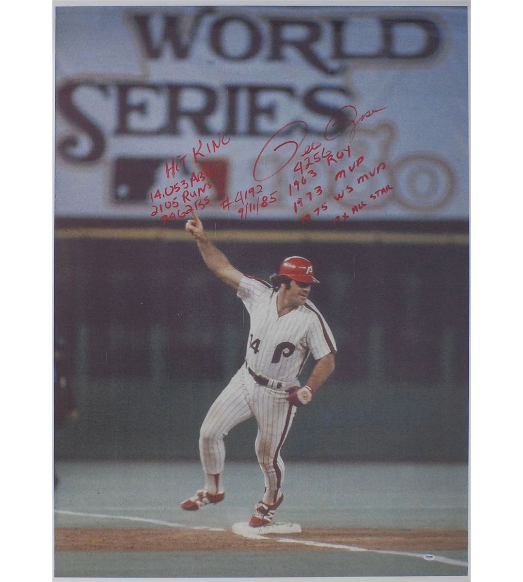 Four different color giclee prints on canvas, from various points of Rose’s career, three approximately 26.75 x 36 and one 36 x 52, each signed in ink or felt tip, with Rose adding some of his career highlights to each. Rolled and in fine condition. Each is accompanied by a certificate of authenticity from PSA/DNA.