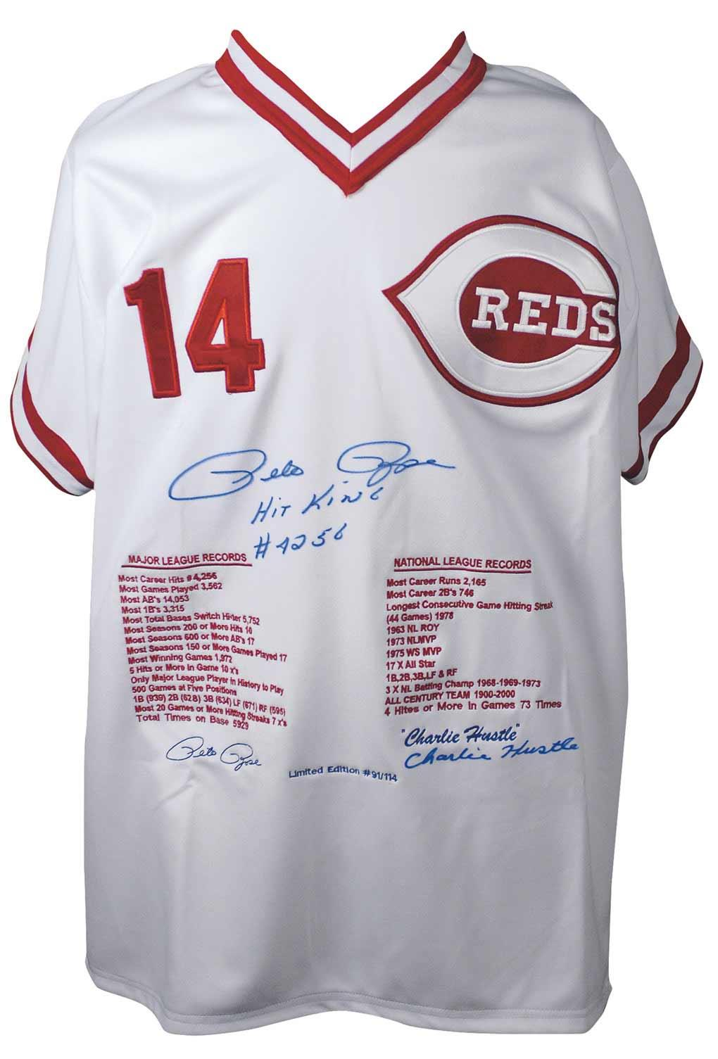Exceptional limited edition replica Cincinnati Reds baseball jersey, numbered 91/114, with sewn-on letters and numbers, complete with all of Rose’s career achievements and highlights embroidered on the front, signed in felt tip on the front, “Pete Rose, Hit King, #4256,” with Rose adding “Charlie Hustle,” at the bottom. In fine condition.