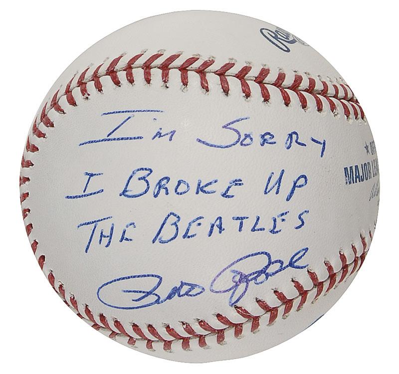 Two official Rawlings Major League baseballs, each signed in blue ballpoint on a side panel, one reading, “I’m sorry I shot J.F.K., Pete Rose,” and the other reading, “I’m sorry I broke up the Beatles, Pete Rose.” In very fine condition. Pre-certified Steve Grad/PSA/DNA and RRAuction COA.