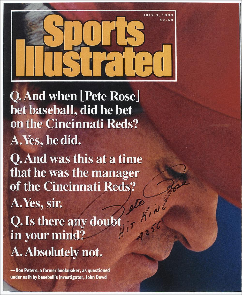Two color 11.5 x 14.5 photos of Sports Illustrated covers concerning Rose’s gambling, one signed in black felt tip, “Pete Rose, Hit King 4256,” the other signed in silver ink, “Pete Rose #4256.” In very fine condition. Pre-certified Steve Grad/PSA/DNA and RRAuction COA.