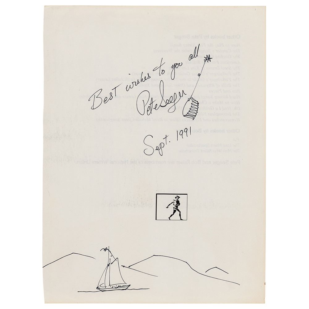 Original sketch by Pete Seeger of a sailboat in front of a mountain range, accomplished in black ink on an off-white 8 x 10.75 book page that is signed "Best wishes to you all, Pete Seeger, Sept. 1991," who adds an additional sketch of a banjo. In fine condition, with a trimmed left edge and light show-through from the typed info on the reverse.