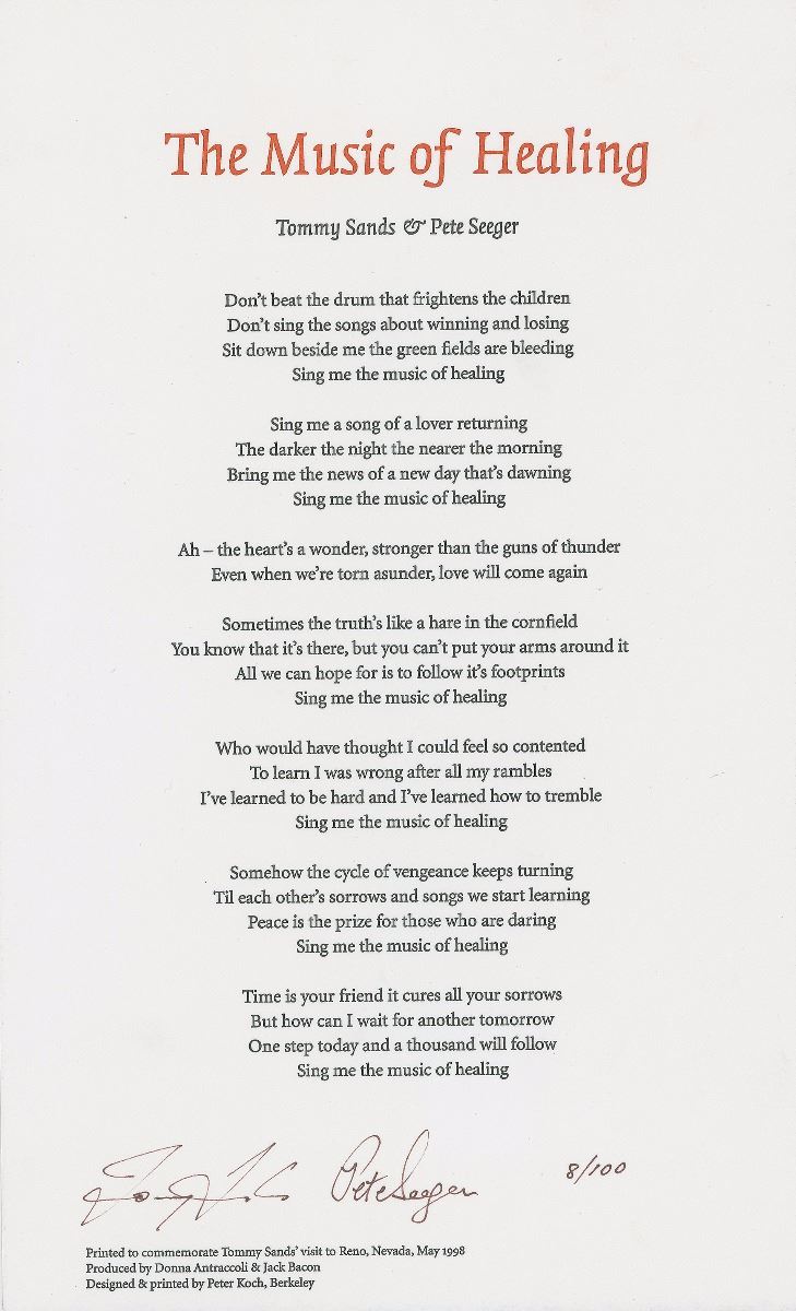 Limited edition broadside featuring the lyrics to ‘The Music of Healing’ printed to commemorate Tommy Sands’ visit to Reno in 1998, 8.5 x 14, numbered 8/100, signed at the bottom in felt tip by Pete Seeger and Tommy Sands. In very fine condition.