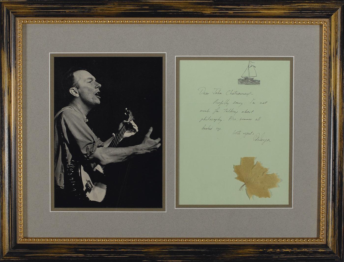 ALS, one page, 8.5 x 11, no date. Brief letter to John Chateauneuf. In full: “Awfully sorry. I’m not much for talking about philosophy. Also, summer all booked up.” Seeger has attached a partial maple leaf to the bottom portion of page. Double matted and framed, with a photo of Seeger, to an overall size of 25 x 19. In fine condition. Oversized.