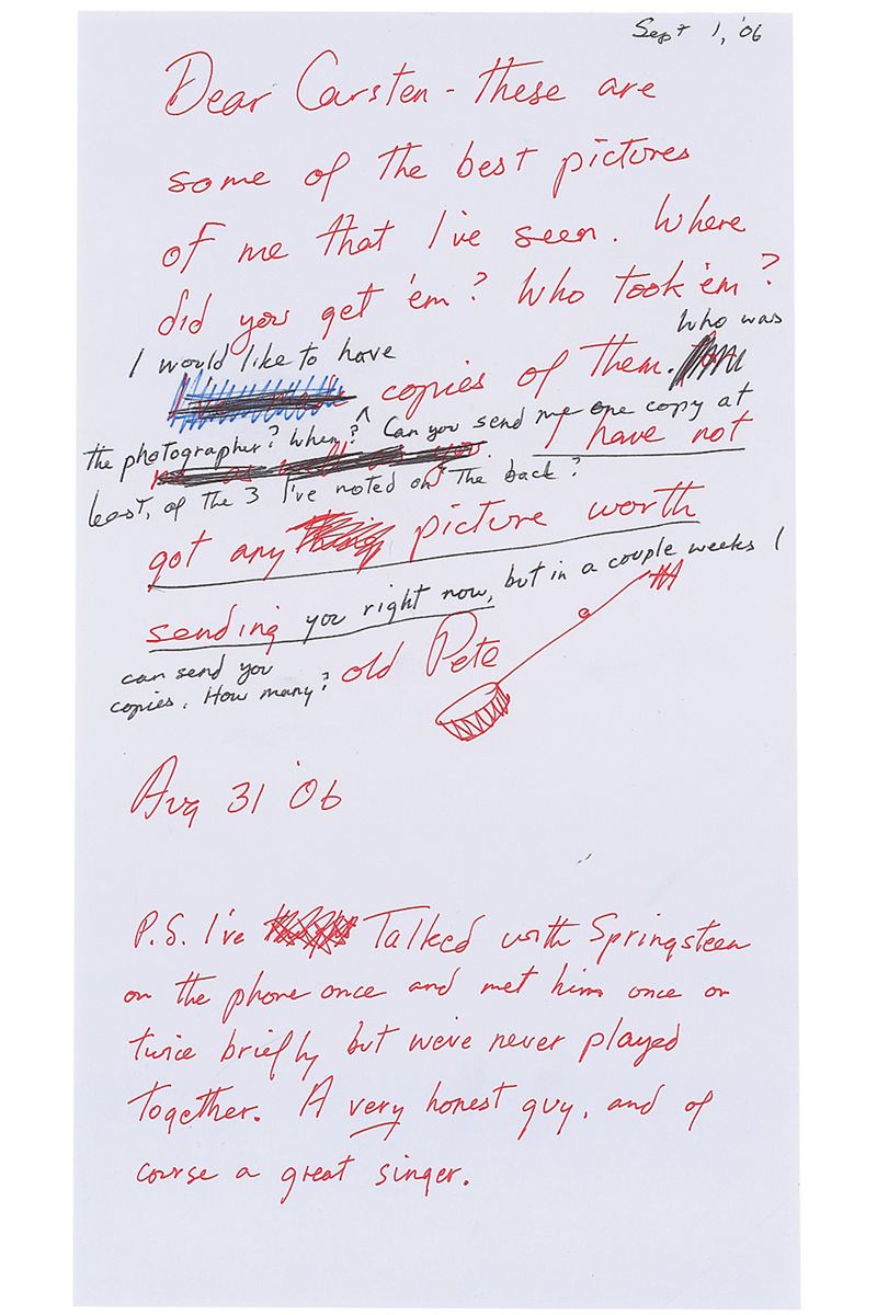 ALS signed “Old Pete” with a sketch of his banjo, one page, 6 x 11, August 31, 2006. Letter to an admirer. In full: “These are some of the best pictures of me that I’ve seen. Where did you get ‘em? Who took ‘em? I would like to have copies of them. Who was the photographer? When? Can you send me one copy at least, of the 3 I’ve noted on the back? I have not got any picture worth sending you right now, but in a couple weeks I can send you copies. How many? P.S. I’ve talked with Springsteen on the phone once and met him once or twice briefly but we’ve never played together. A very honest guy, and of course a great singer.” In fine condition, with a few original cross-outs and corrections.