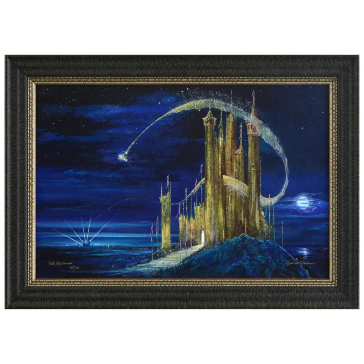 "Gold Castle" is a framed limited edition giclee on canvas, numbered 147 out of 195 and hand signed by Peter (1913-2007) and Harrison Ellenshaw! This piece is licensed by Disney Fine Art. Includes Certificate of Authenticity! Measures approx. 31.5" x 22.5" (with frame); 26.5" x 17.5" (image). ** Please note: there is noticeable wear to the frame, but the artwork itself is intact. ** Reference #: 217190