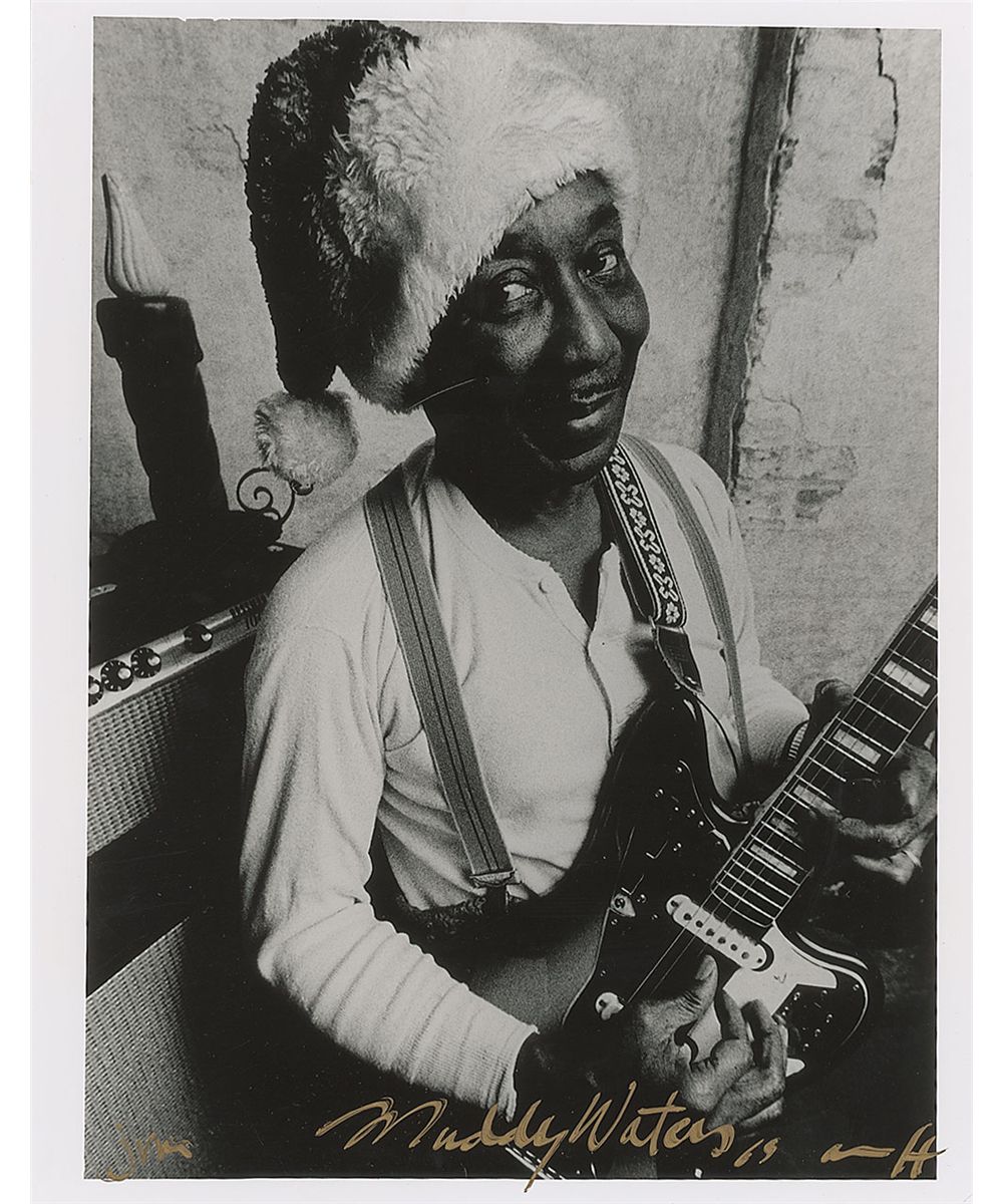 Glossy 11 x 14 Peter Amft photo of Waters wearing a Santa hat and playing his guitar, notated and signed in gold ink by the photographer, “Muddy Waters 69, Amft.” In fine condition.