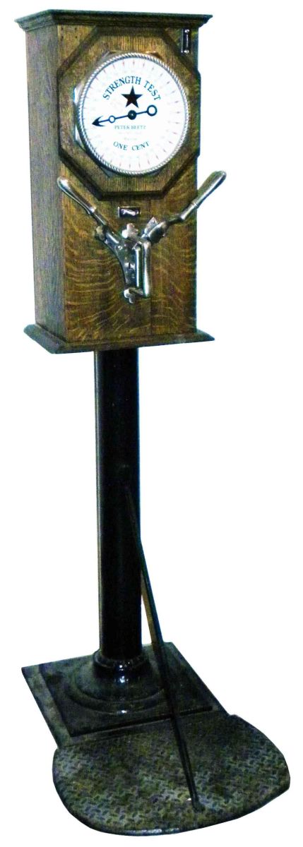 Peter Beetz, NY. One Cent Coin Operated Strength Tester. Very Good Working condition. Comes with key for machine and coin box. 20 X 64 X 31 inches.