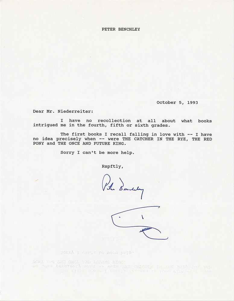 TLS, one page, 8.5 x 11, October 5, 1993. Letter to a schoolteacher, in part: "I have no recollection at all about what books intrigued me in the fourth, fifth or sixth grades. The first books I recall falling in love with--I have no idea precisely when--were The Catcher in the Rye, The Red Pony and The Once and Future King." Benchley signs at the conclusion, adding a sketch of a shark evoking his bestselling 1974 novel Jaws. In fine condition.