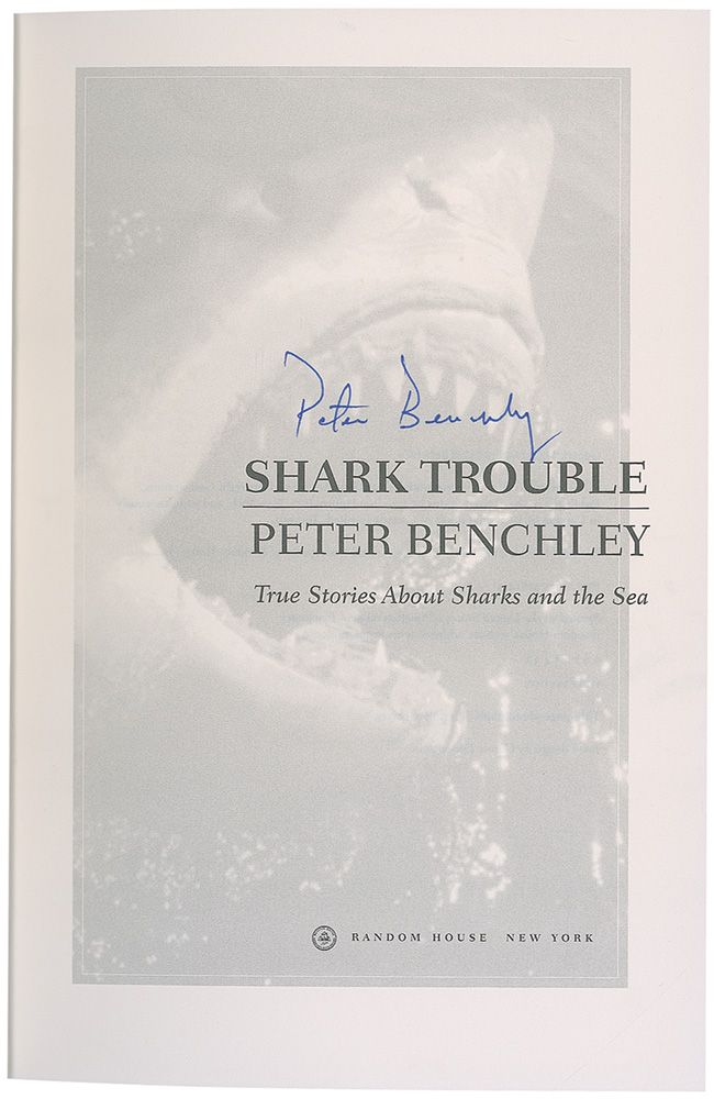 Two items: original signed and inscribed felt tip sketch of Jaws on a white 8.5 x 11 sheet; and a hardcover first edition later printing copy of Shark Trouble, signed on the title page in blue ink. In fine condition, with two horizontal mailing folds to sheet.