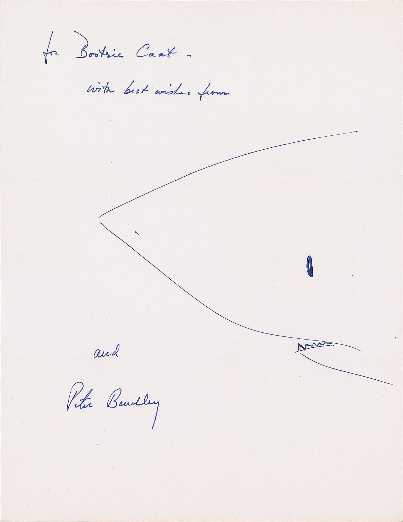 Two items: a wonderful original ink sketch of a 'Jaws' shark face on a white 8.5 x 11 sheet, signed and inscribed in blue ink, "For Bootsie Caat—with best wishes from…and Peter Benchley"; and a glossy 5 x 7 Random House publicity photo of Benchley, signed and inscribed in blue felt tip, "To: Matthew...—best wishes, Peter Benchley." In overall fine condition. Accompanied by the original mailing envelope for the sketch, which is addressed in Benchley's own hand.