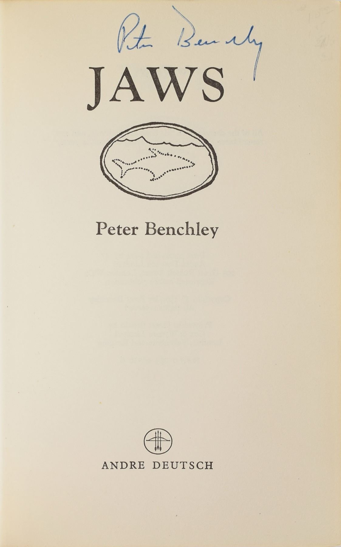 Signed book: Jaws. First UK edition. London: Andre Deutsch, 1974. Hardcover with dust jacket, 5.5 x 8, 272 pages. Signed on the title page in black felt tip by Benchley. In fine condition, with light wear to the dust jacket.